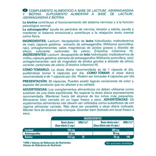 Suplemento alimentar formulado com proteína do leite, extracto de ashwagandha e biotina. A sinergia dos seus ingredientes apoia a função psicológica normal e promove uma sensação de relaxamento, graças às suas propriedades calmantes. Adequado apenas para adultos.