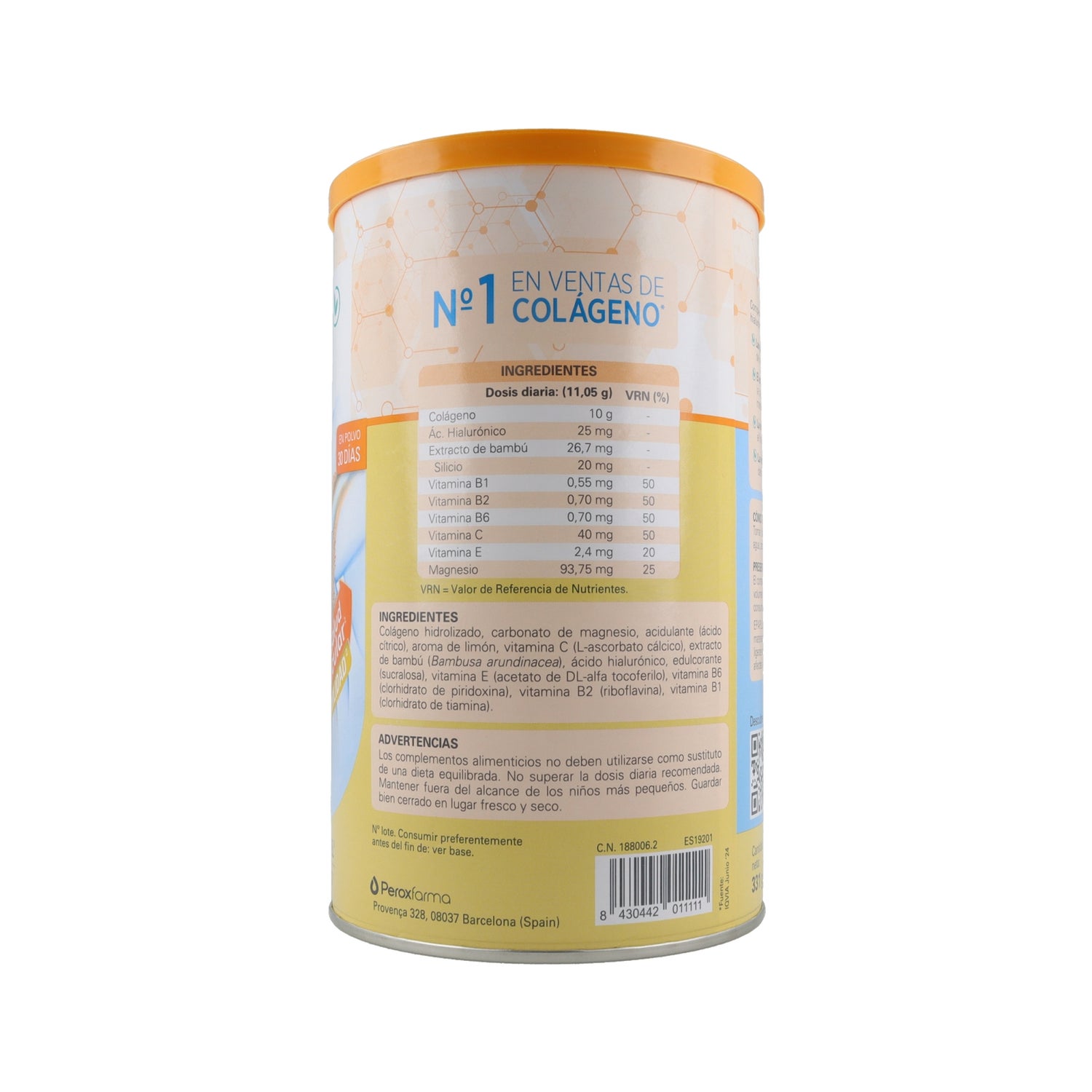 COLAGÉNIO HIDROLISADO, SILÍCIO, CARBONATO DE MAGNÉSIO, AROMA DE BAUNILHA, AROMA DE CARAMELO, ÁCIDO CÍTRICOTRICLORETO ANIDRO (ACIDIFICANTE), VITAMINA C, ÁCIDO HIALURÔNICO, SUCRALOSE (ADOÇANTE), VITAMINA B2, VITAMINA B6 E VITAMINA B1.