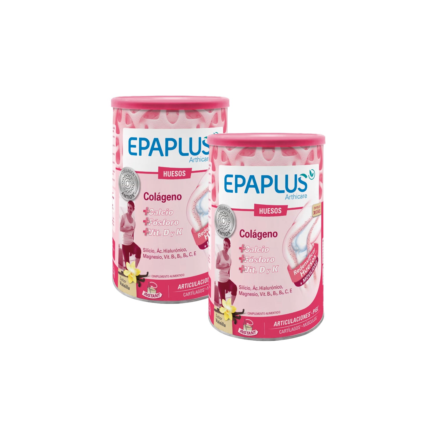 Epaplus Pack Arthicare Ossos Colágeno Antiox Baunilha 2x388g é um complemento alimentar à base de colágeno hidrolisado, silício (do extrato de bambu), cálcio, ácido hialurônico, magnésio, vitamina C, vitamina D3, vitamina K2, fósforo, vitaminas B1, B2 e B6 e, agora também vitamina E, indicado para adultos que buscam manter e aumentar a massa muscular, e ter seus ossos e articulações em condições ótimas.