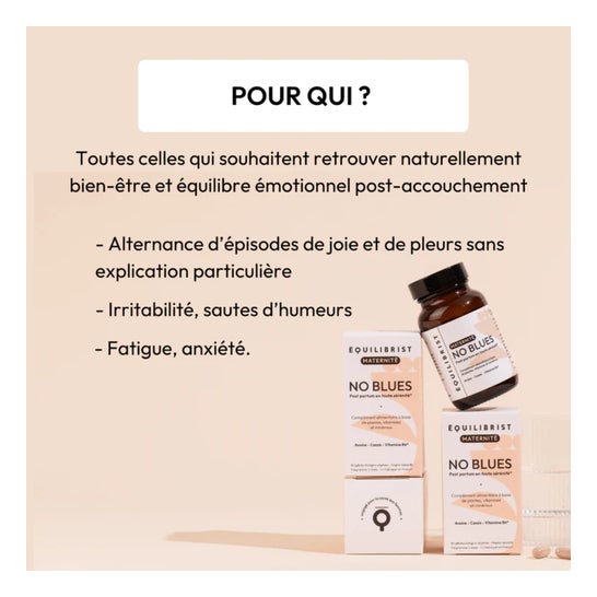 Equilibrist No Blues 60caps é um complemento alimentar à base de plantas, vitaminas e minerais que apoiam o bem-estar e equilíbrio emocional após o parto.