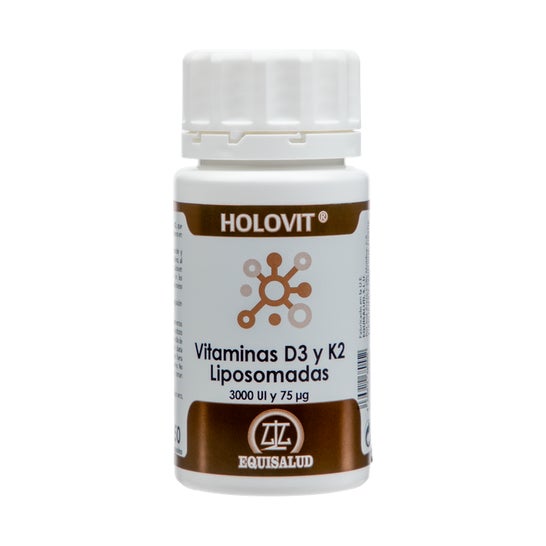 Equisalud Holovit Vitaminas D3 e K2 Lipos 3000 Ui e 75 Mcg 50 caps é um suplemento que combina duas vitaminas essenciais para o organismo.
