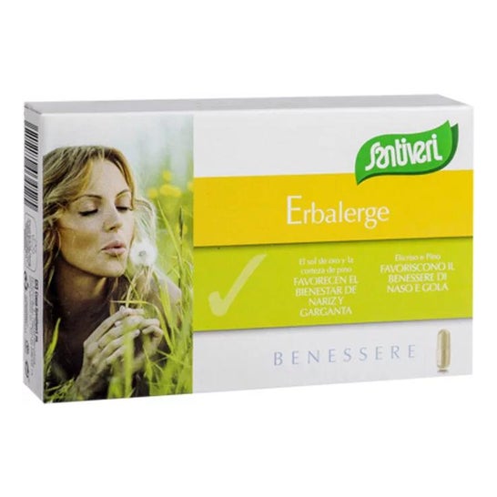 Erbalerge 10Cps 18G é um suplemento alimentar que contém extrato seco de fumeiro, goldenseal e pinho marítimo. O sol dourado e a casca de pinheiro contribuem para o conforto do nariz e da garganta. Este produto é recomendado como suporte para o alívio de alergias, constipações ou congestão nasal.