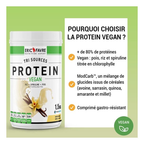 Eric Favre Protein Vegan Chocolate Avelã 500g é uma fórmula 100 % vegetal que combina ervilha, arroz e espirulina para oferecer 80 % de proteínas naturais de alta qualidade nutricional.