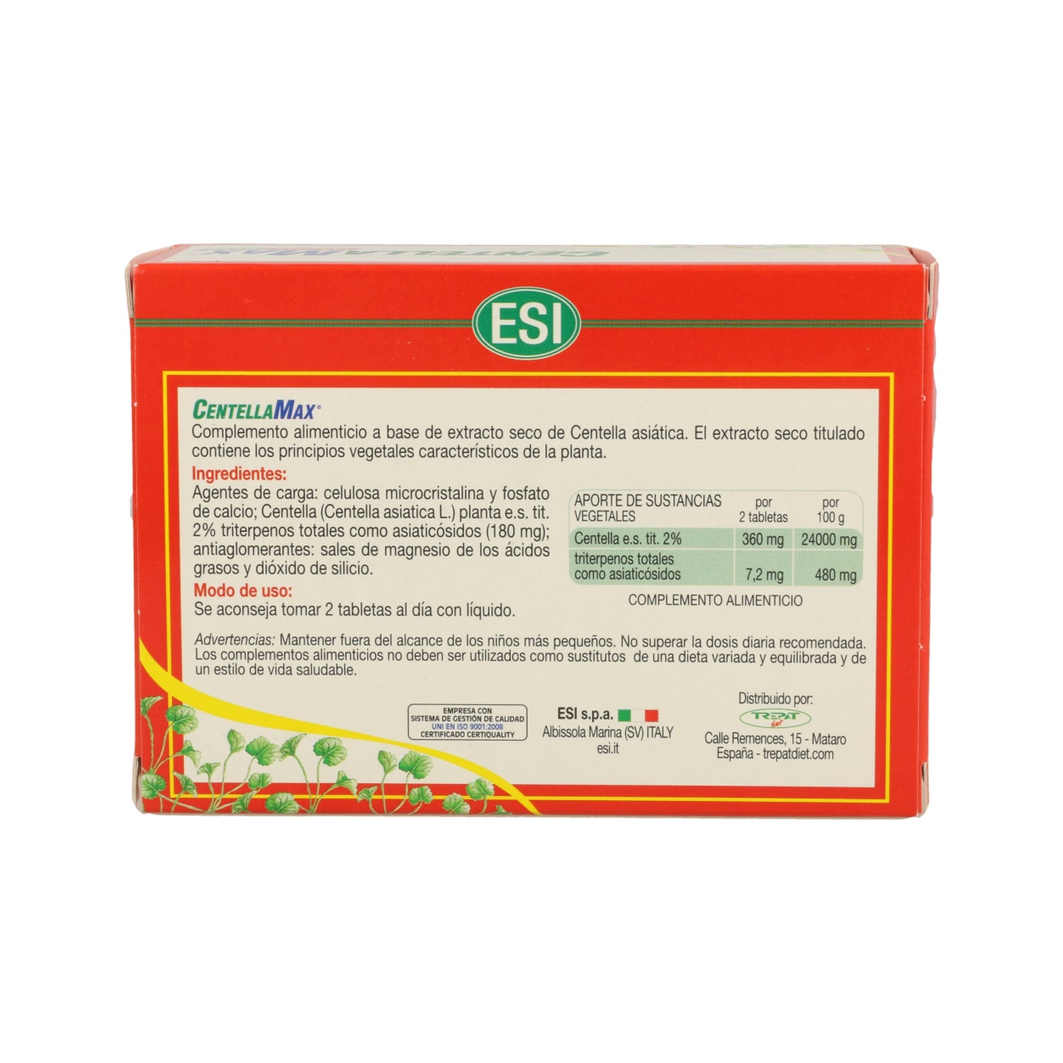 CENTELLA MAX:CENTELLA (CENTELLA ASIÁTICA) SUMIDAD POLVO (200 MG), CENTELLA (CENTELLA ASIATICA) SUMIDAD E.S. (*) TIT. 2% DE ASIATICÓSIDOS (180 MG); ANTIAGLOMERANTES: ESTEARATO DE MAGNÉSIO VEGETAL E DIÓXIDO DE SILÍCIO. AGENTES DE CARGA: CELULOSE MICROCRISTALINA E FOSFATO DE CÁLCIO.