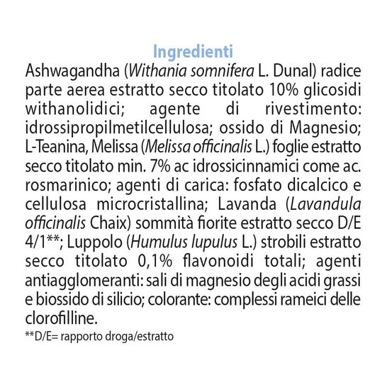 Suplemento alimentar em forma de cápsula, que ajuda a combater o stress físico e mental. Promove o relaxamento e o bem-estar mental de uma forma natural. É constituído pelos seguintes ingredientes activos: ashwagandha, para relaxamento e bem-estar mental; bálsamo de limão, para reduzir estados de agitação, tensão e instabilidade emocional; lúpulo, para um efeito calmante no sistema nervoso; lavanda, para aliviar sintomas ligeiros de stress mental e exaustão; L-Theanina, para relaxamento; magnésio, para contribuir para o funcionamento normal do sistema nervoso. Adequado para maiores de 18 anos de idade. Adequado para veganos e celíacos. Não tomar durante a gravidez e lactação.