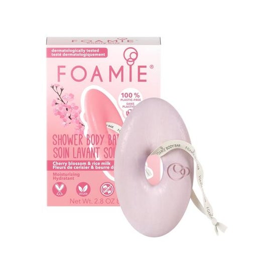 Barra para uso corporal, produto de cuidado de higiene pessoal da Foamie. A composição contém leite de cereja e arroz.