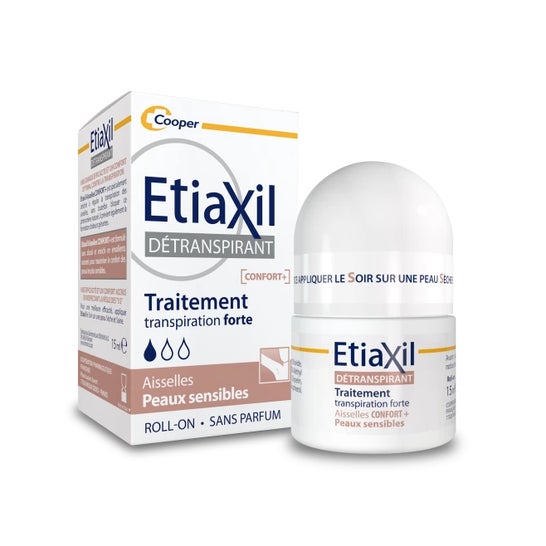 Etiaxil Détranspirant Traitement Confort+ Peaux Sensibles 15ml é um tratamento para a transpiração intensa que ajuda a regular a transpiração excessiva nas axilas. Este desodorizante roll-on formulado com cloreto de alumínio ajuda a abrandar a produção de suor, colocando as glândulas sudoríparas em repouso. O complexo protetor CPx equilibra o pH da pele e reduz o risco de irritação cutânea, limitando ao mesmo tempo a formação de odores da transpiração. Enriquecido com emolientes naturais, maximiza o conforto das peles sensíveis ou delicadas. Formulado sem perfume nem álcool, é compatível com a utilização diária de um desodorizante ou de um perfume.