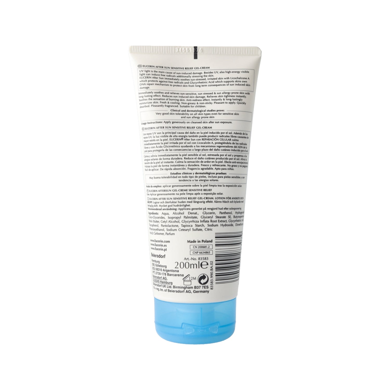 Eucerin After Sun Sensitive Relief Gel Cream 200ml é um gel-creme facial e corporal transparente que ajuda a pele a recuperar e a suavizar após a exposição solar, especialmente a pele sensível.