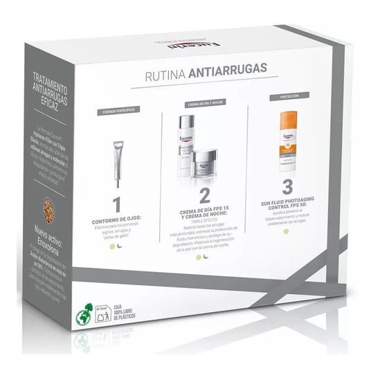 Eucerin Hyaluron-Filler Face Chest Pele Normal e Mista: Creme de Dia SPF 15 50ml + Creme de Noite 50ml é uma caixa facial Eucerin de edição limitada para pele normal e mista. Contém Eucerin Hyaluron-Filler Creme de Dia SPF 15 50ml e Eucerin Hyaluron-Filler Creme de Noite 50ml, dois tratamentos de dia e de noite que ajudam a prevenir o envelhecimento prematuro da pele, estimulam a produção de ácido hialurónico, reduzem as rugas e proporcionam uma hidratação intensa ao rosto.