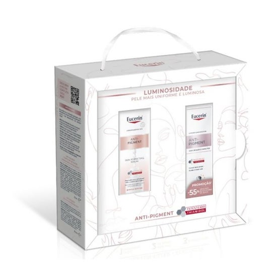 Pacote Eucerin Anti-Pigment Sérum Skin Perfecting + Contorno de Olhos inclui dois produtos projetados para melhorar a aparência da pele.