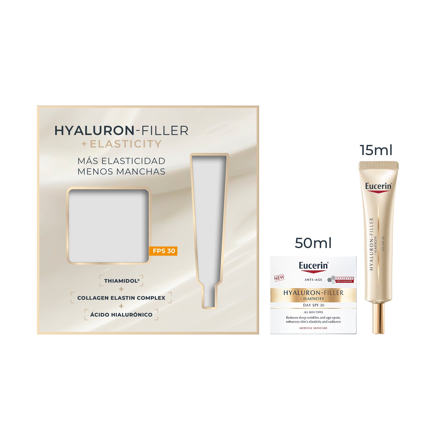 Eucerin Elasticity Filler Day Cream SPF30 50ml:Aqua, Glycérine, Salicilato de Etilhexilo, Octídodecanol, Álcool Cetearílico, Glicol de Butileno, Estearato de Glicerilo, Glicol de Pentileno, Triglicérido Caprílico/Caprico, Metoxidibenzoilmetano de Butilo, Etilhexil Triazona, Metilpropanodiol, Éter de Dicaprylyl, Bis-Etil-hexiloxifenol Metoxifenil Triazina, Fosfato de Distarch, Silimarina, Hialuronato de Sódio, Extrato de frutas Arctium Lappa, Palmitato de Ascorbilo, Lecitina, Tocoferol, Óleo de semente de Soja de Glicol, Glicerídeos Hidrogenados de Palma, Glicerídeos Hidrogenados de Coco, Carbômero de Sódio, Dimeticone, Acrilatos de Sódio/C10-30 Acrilato de Alquil Crosspolímero, Dicapato de Butileno e Glicol Dicaprylate, Álcool Benzílico, EDTA Trissódico, Glicol Caprylyl, BHT, Parfum.