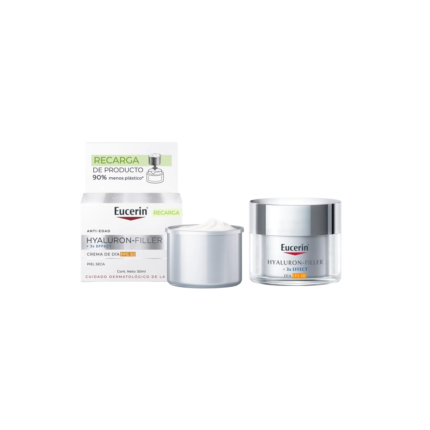 Eucerin Hyaluron-Filler Dia 3X Effect SPF30 50ml é um creme facial antienvelhecimento para todos os tipos de pele que favorece uma pele mais luminosa, hidratada e lisinha.