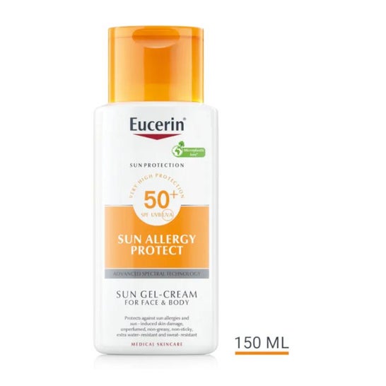 Eucerin® Sun Allergy Protection SPF 50+ é um gel-creme que proporciona uma proteção extremamente elevada contra os raios UVA/UVB. Este tratamento foi especialmente concebido para proteger a pele de alergias solares como a Fotomatose Polimórfica (PLE) e a acne de Verão.