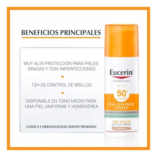 Eucerin Sun Oil Control Tinted Dry Touch Gel-Crema Tom Médio SPF50+ 50ml é um protetor solar facial de uso diário com cor em formato gel-creme para pele oleosa e com tendência a acne.