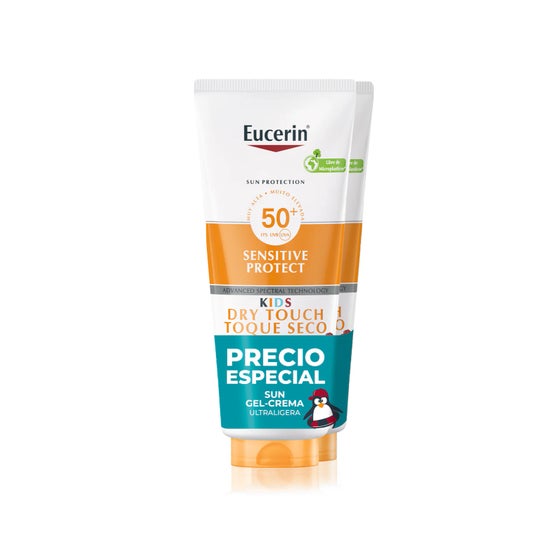 Eucerin Sun Sensitive Protect Kids Gel Creme SPF50+ 2x200ml é um protetor solar em spray pediátrico que contribui para acalmar e proteger a pele sensível dos raios UVA e UVB.