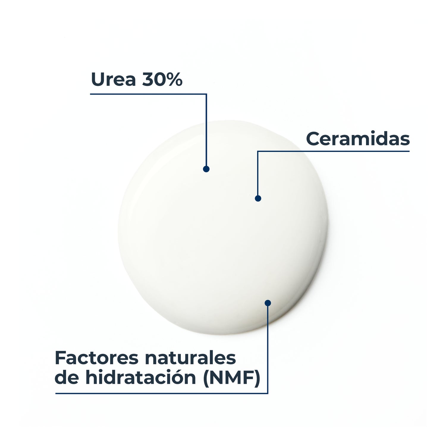 Formulado com ureia altamente concentrada a 30% com uma ação esfoliante, fatores de hidratação natural (NMF) que além de hidratar a pele e reter a água na pele e ceramidas que ajudam a reparar e restabelecer a barreira cutânea.