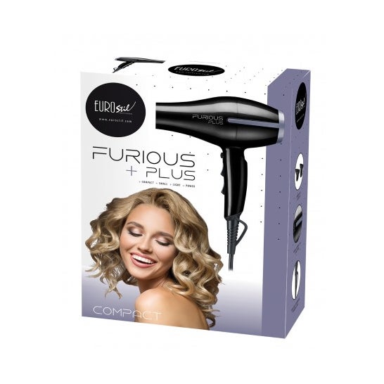 O secador Furious Plus da Eurostil tem uma potência de 2200W e tecnologia iónica, cerâmica e turmalina que permite uma secagem mais rápida e um acabamento mais suave e brilhante do cabelo.