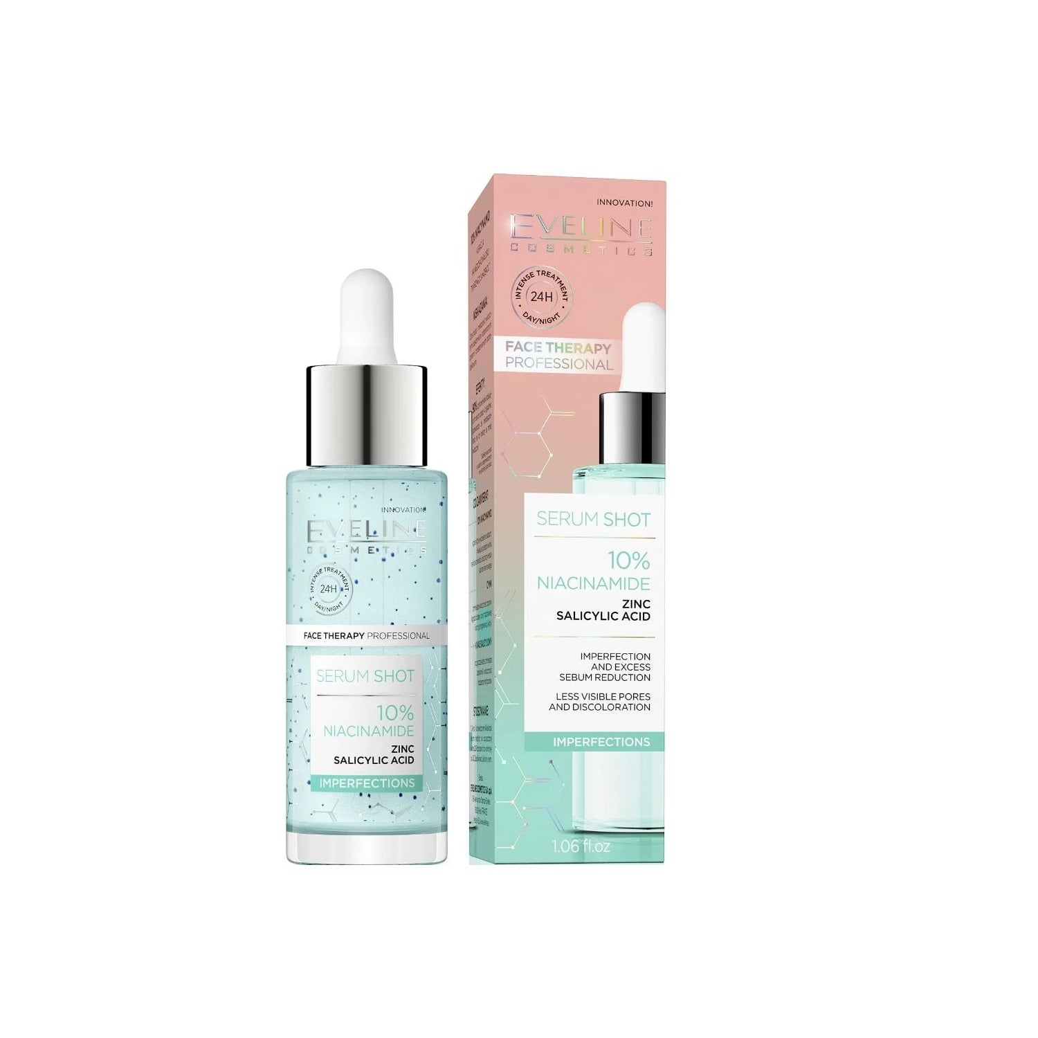 Eveline Cosmetics 10% Niacinamida Sérum Shot 30ml é um sérum especialmente formulado para peles oleosas e com problemas. Seu conteúdo de niacinamida atua de maneira eficaz sobre as lesões de acne e as imperfeições da pele.