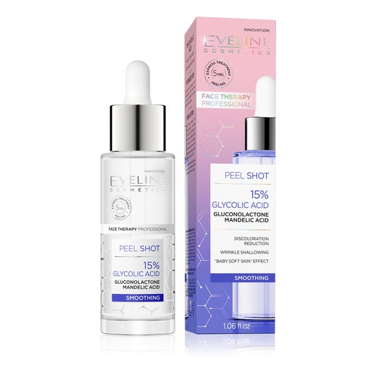 Eveline Cosmetics 15% Ácido Glicólico Peeling Shot 30ml é um esfoliante facial que contém 15% de ácido AHA. Esta fórmula altamente eficaz oferece um potente efeito renovador que transforma a pele, destacando sua beleza natural.
