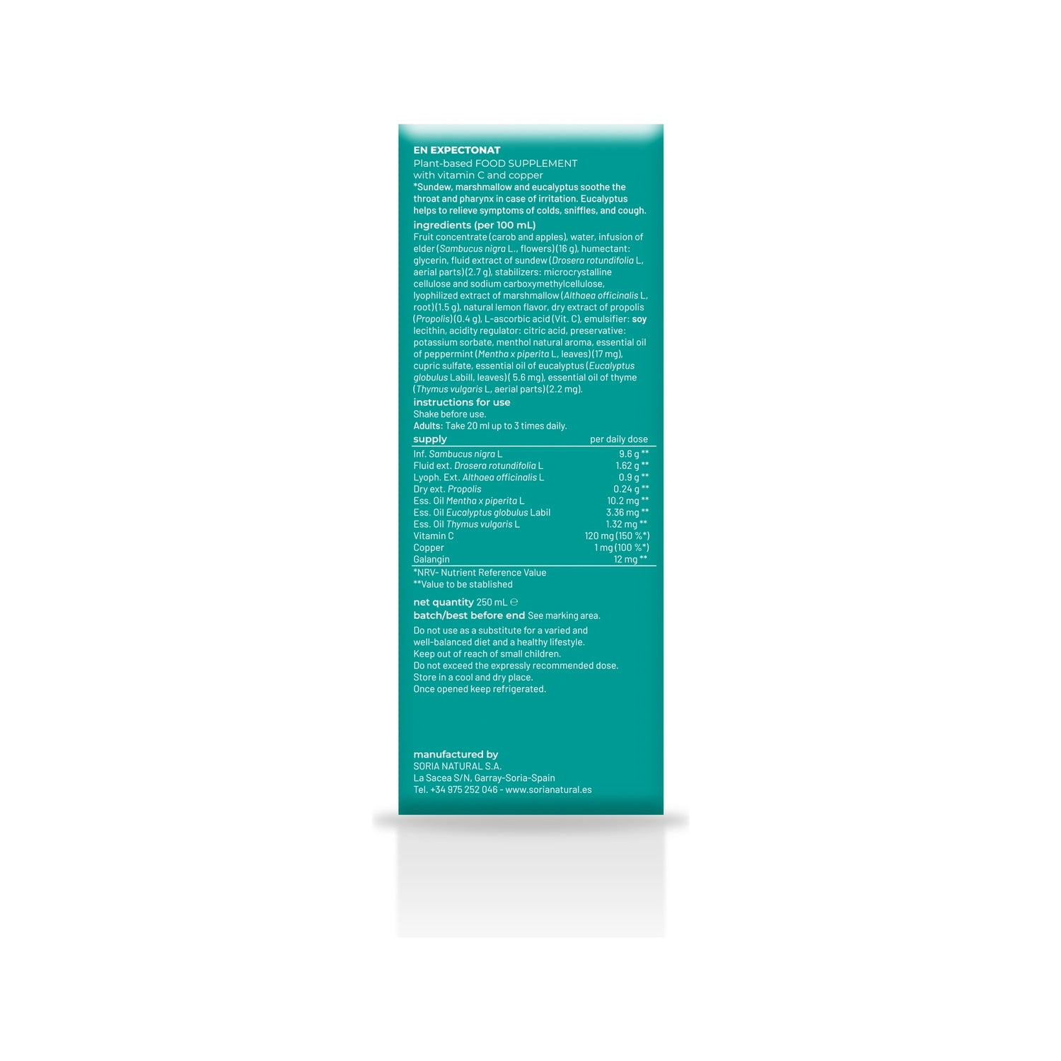 Suplemento alimentar com sabugueiro, malva, drosera, eucalipto, tomilho e hortelã indicado para melhorar o aparelho respiratório e para o cuidado da garganta e das vias respiratórias, ajudando a: