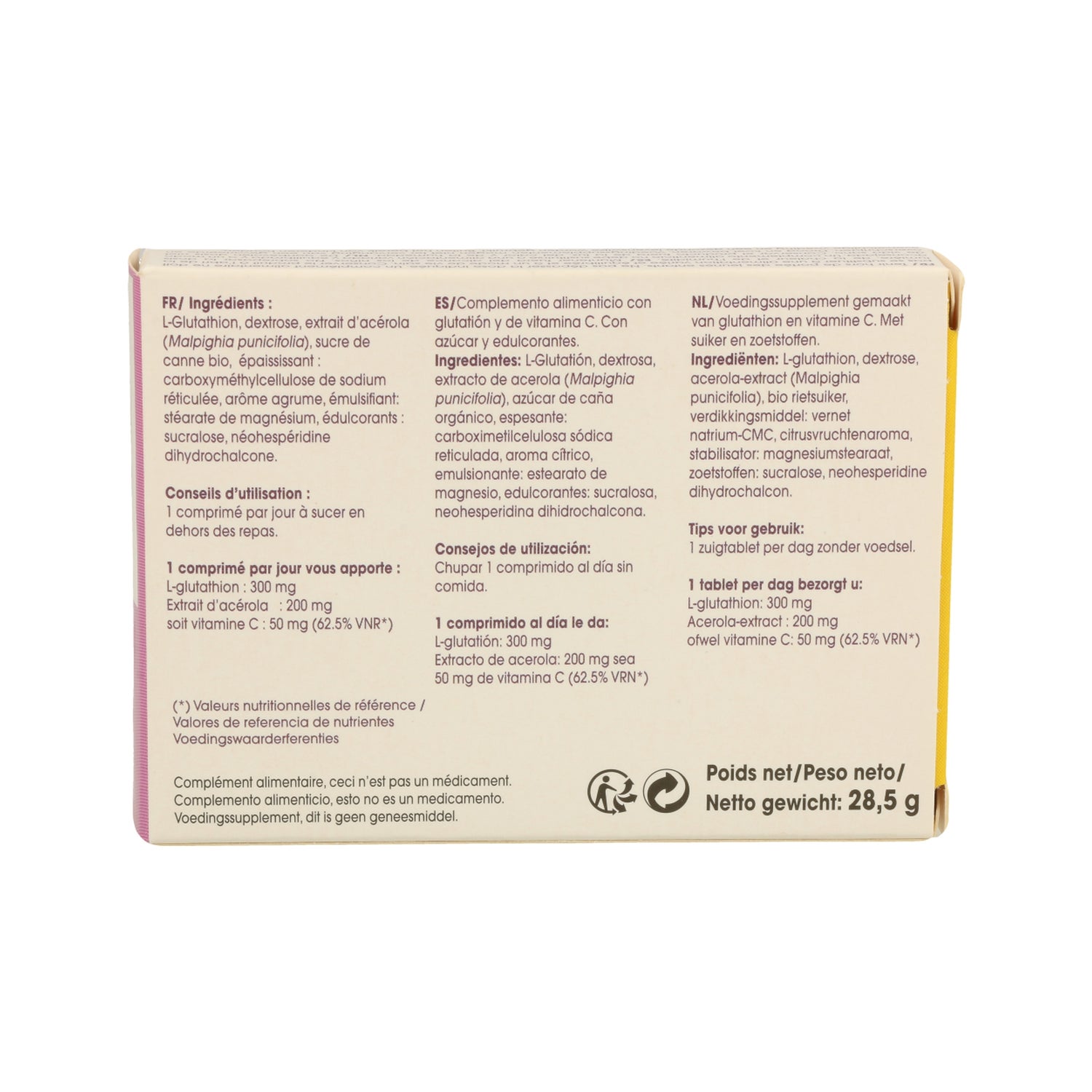 Suplemento alimentar à base de glutatião e vitamina C. O glutatião é uma substância constituída por aminoácidos, presente nas células do nosso organismo e que intervém no transporte do hidrogénio.