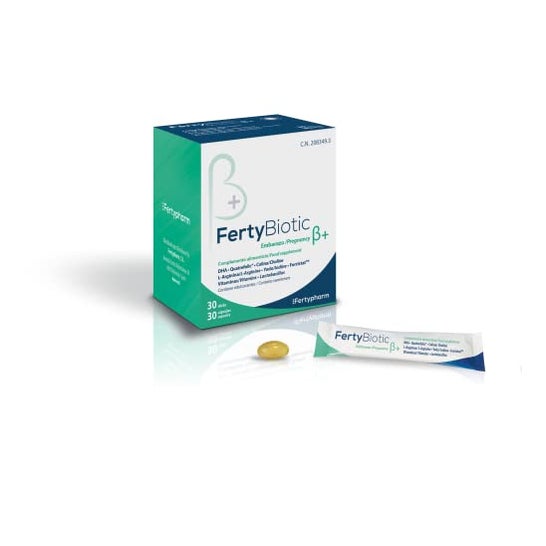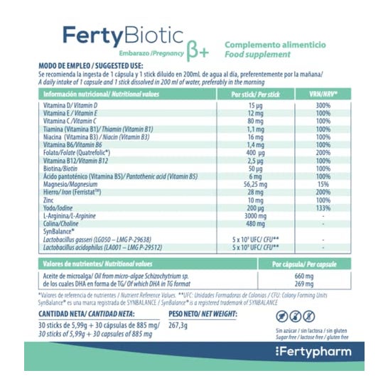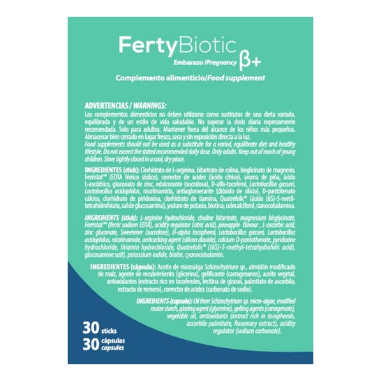 O Fertibiótico Gravidez B+ 30sticks + 30caps é um suplemento alimentar que ajuda a fornecer nutrientes e probióticos para a primeira fase da gravidez (até às 12 semanas de gestação). Também ajuda ao correcto desenvolvimento embrionário. Sem glúten e sem lactose. Adequado para veganos.