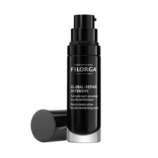 Filorga Global Repair Intensive Serum 30ml é um sérum multi-revitalizante formulado com ceramidas, ómegas e vitaminas para proporcionar nutrição, elasticidade e vitalidade à pele. Ajuda a atenuar os sinais de envelhecimento (rugas, flacidez, manchas, falta de luminosidade, etc.), é fácil de aplicar e oferece um acabamento aveludado, indicado para todos os tipos de pele, especialmente para aquelas com sinais de desidratação, rugas marcadas, falta de firmeza e fadiga.