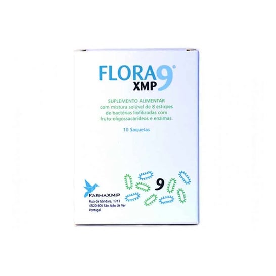 Flora 9 XMP 10x4g é um complemento alimentar que combina 8 cepas de bactérias com uma mistura de prebióticos e enzima amilase, utilizando uma tecnologia de novo desenvolvimento denominada ProbioAct.