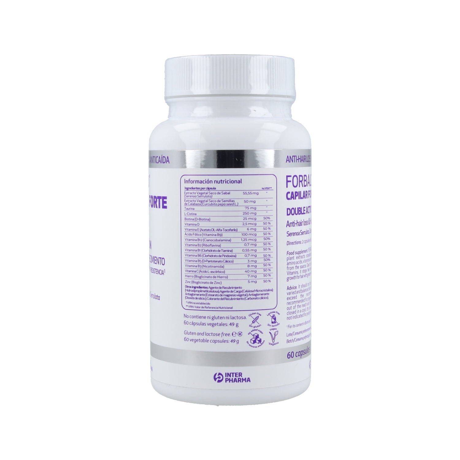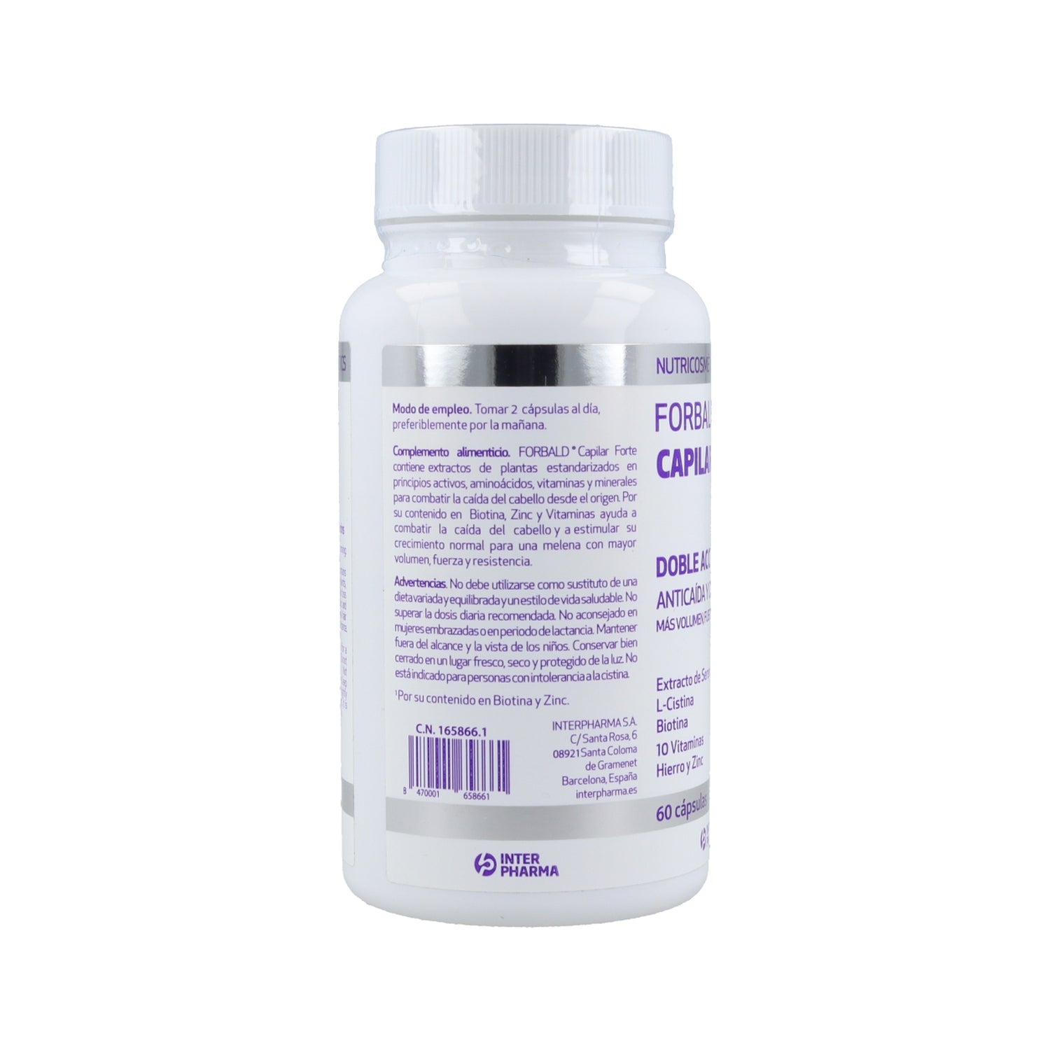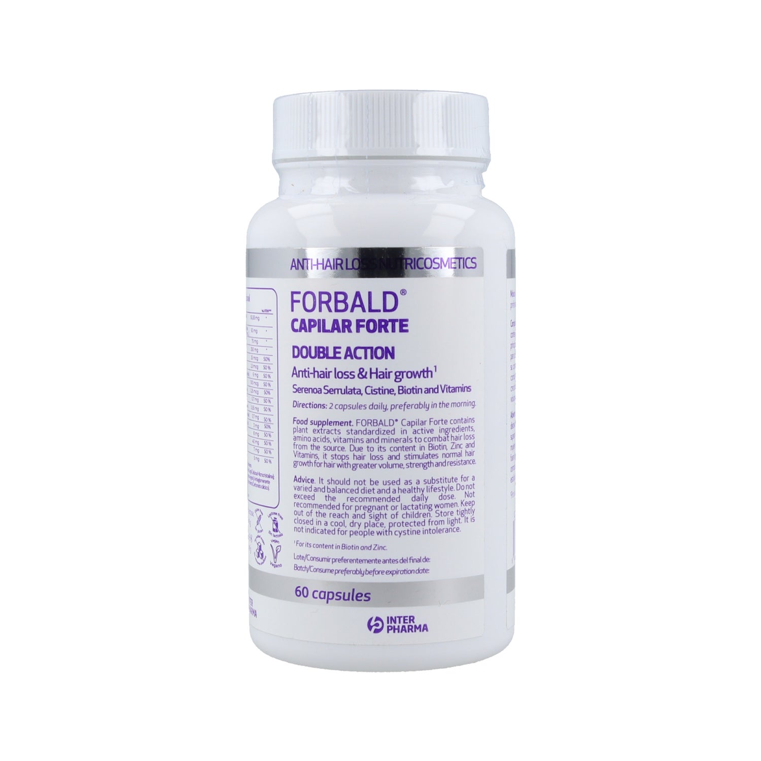 Forbald capilar Forte 60càps é um suplemento alimentar que ajuda a parar a queda de cabelo, fortalece o cabelo e promove o seu crescimento, tanto no cabelo dos homens como das mulheres. Contém uma grande contribuição de vitaminas, minerais e extractos de plantas que reforçam o cabelo desde o interior, revitalizando e aumentando o volume capilar.