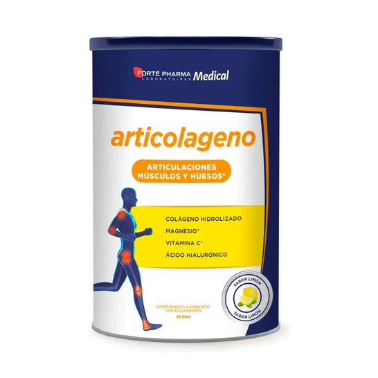 Forté Pharma Articolágeno Sabor Limão 349,5g é um suplemento alimentar à base de colagénio hidrolisado, ácido hialurónico, magnésio e Vitamina C.