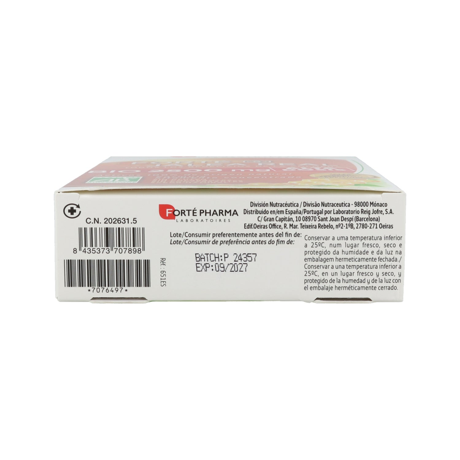 Suplemento alimentar de consumo diário, que tem como objetivo apoiar uma nutrição equilibrada. A sua fórmula é baseada em componentes totalmente naturais, como a geleia real e o mel. É um produto que não contém corantes, conservantes ou glúten. O suplemento alimentar da Forte Pharma só pode ser consumido por pessoas que não sofram de asma e alergias a produtos como o mel ou qualquer outro tipo de condição atópica. Para que o produto apoie uma boa nutrição diária, deve ser consumido uma vez por dia. A melhor forma de tomar esta dose é de manhã, misturando o líquido da cápsula com um copo de água ou qualquer sumo de fruta. A sua ingestão ajudará a que os nutrientes consumidos durante o dia sejam mais bem aproveitados pelo organismo.
