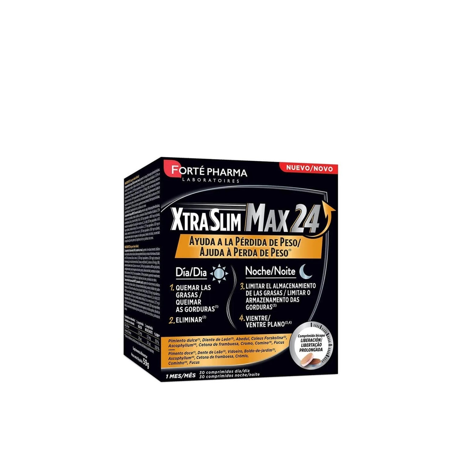Forte Pharma Xtra Slim Max 24 60caps é um suplemento alimentar em comprimidos indicado para o controlo do peso e para ajudar no processo de emagrecimento. É formulado a partir de extractos de plantas: o dente-de-leão e o boldo favorecem a eliminação e apoiam a função hepática; as algas fucáceas que contém melhoram a redução das gorduras e o cominho limita eventuais desconfortos digestivos.