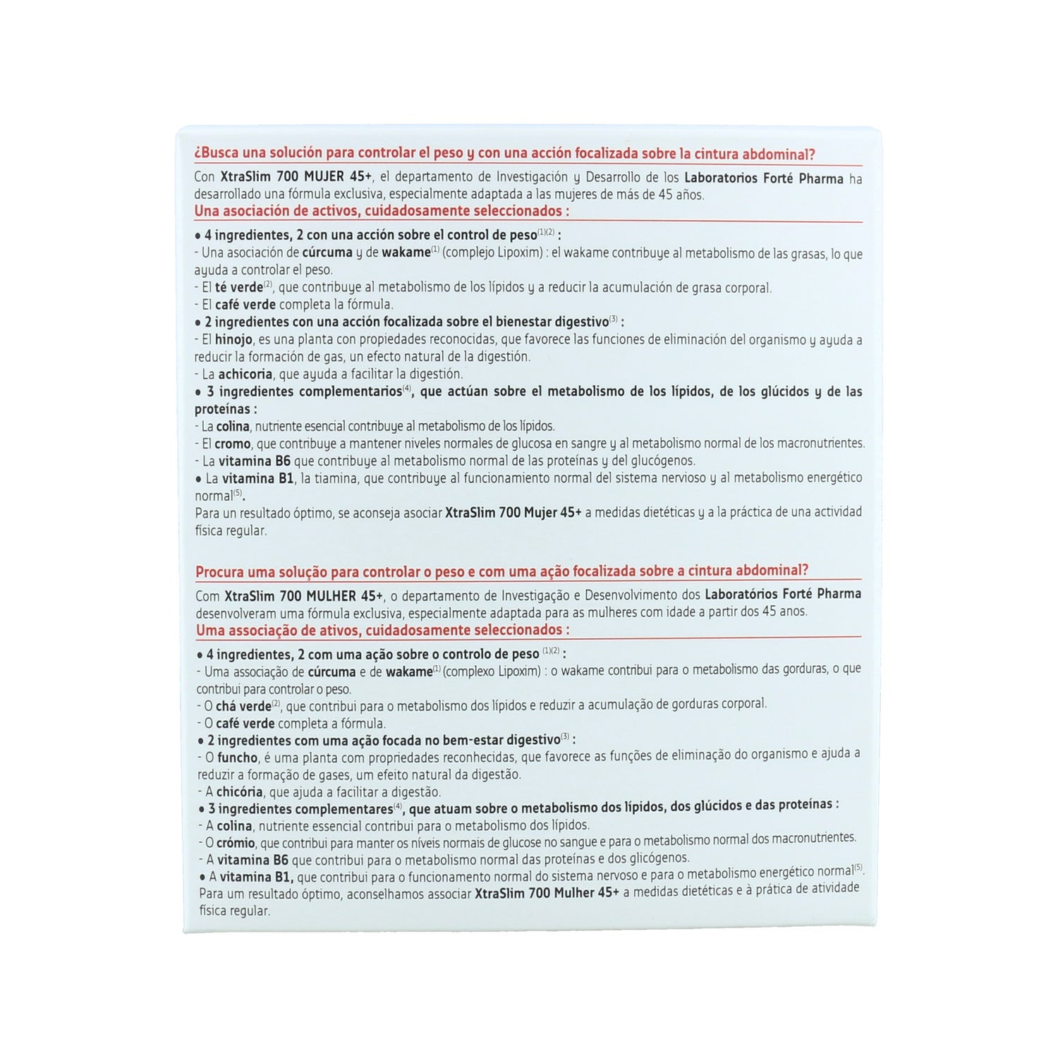 Forté Pharma XtraSlim 700 Woman 45+ 120caps é um suplemento alimentar à base de princípios activos naturais como o curcuma, o chá verde ou o café verde, que pode contribuir para a perda de peso