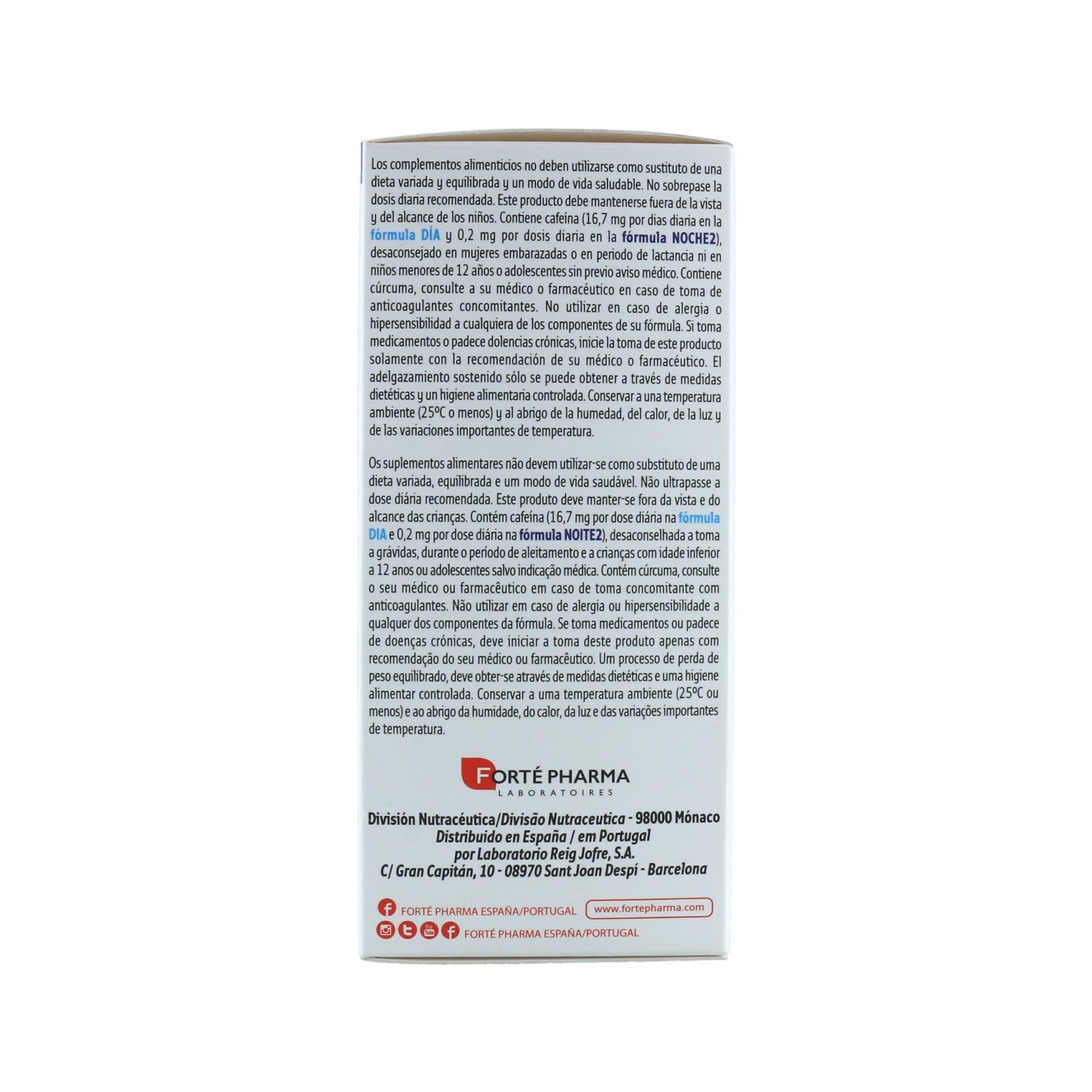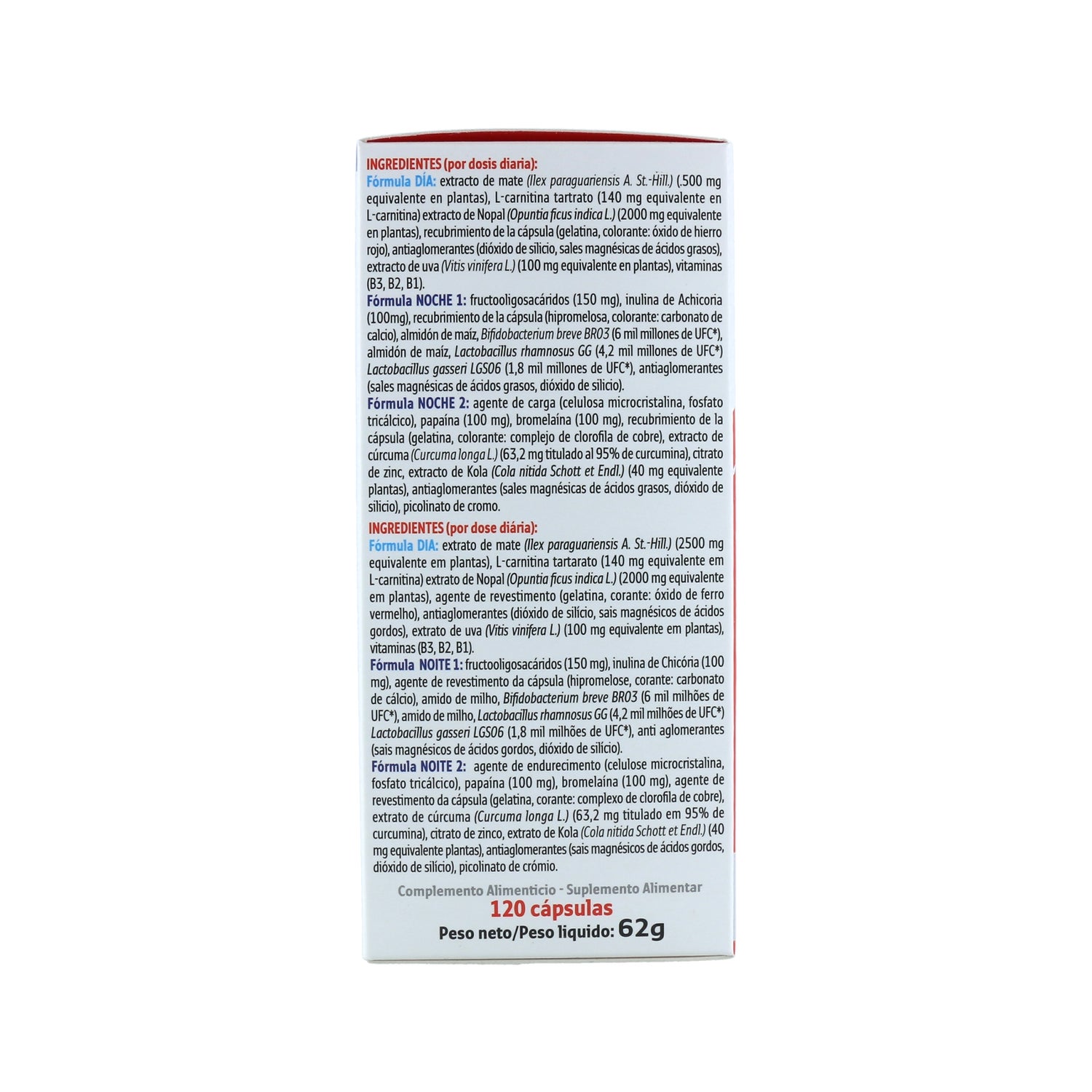 Por outro lado, a fórmula de noite ajuda a reduzir o armazenamento de gorduras e a reduzir o peso, graças à acção de 3 estirpes microbióticas (Lactobacillus gasseri LGS06, Bifidobacterium breve BR03, Lactobacillus rhamnosus GG), inulina de chicória, fruto-oligossacáridos, curcuma, Kola, enzimas e minerais.
