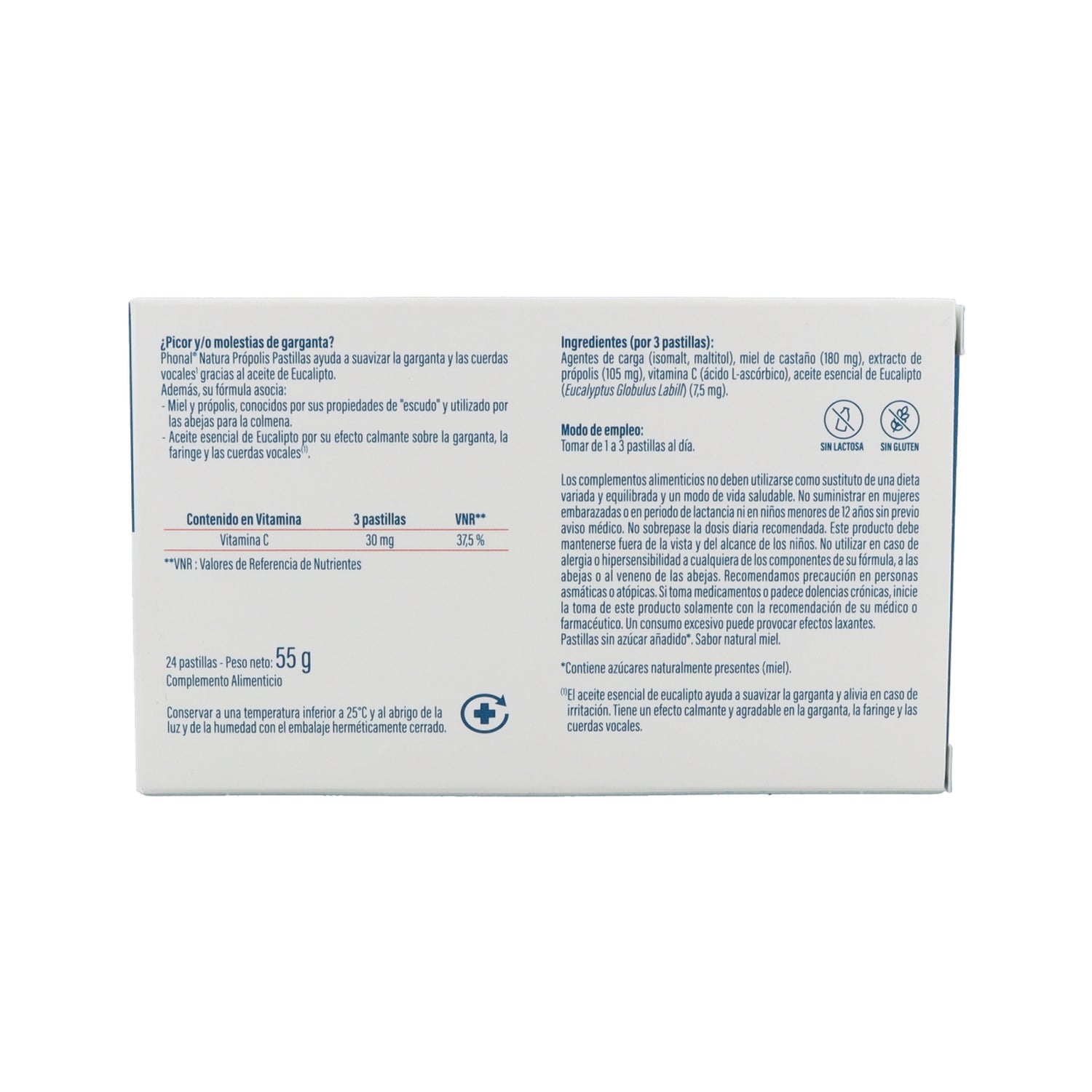 Phonal Nature Própolis Mel 24 pastilhas para chupar é um suplemento em formato de pastilhas que ajuda a suavizar a garganta.