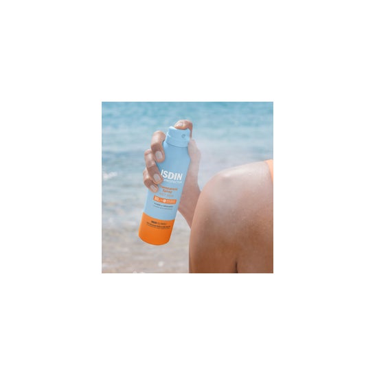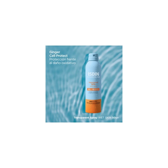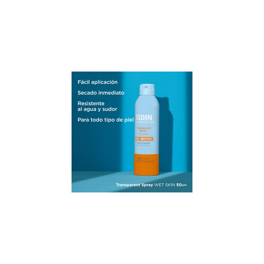 ISDIN Transparent Spray Wet Skin SPF50 250ml é um protector solar transparente, de secagem rápida em spray com acabamento transparente