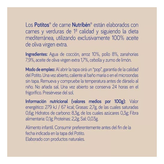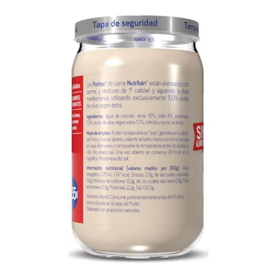 Nutribén® Potitos® Frango, Arroz 235g são elaborados exclusivamente com ingredientes naturais para proporcionar refeições equilibradas e adaptadas às necessidades do seu filho, seguindo as recomendações da ESPGHAN. São concebidos para que o seu filho descubra novos sabores e texturas e se familiarize com novos paladares.