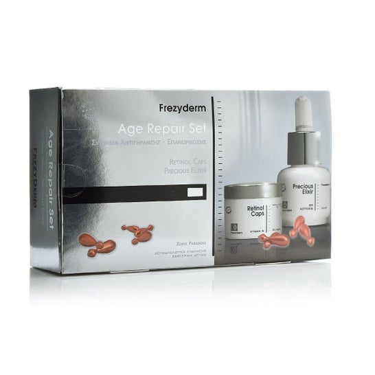 Frezyderm Age Repair Set é um programa intensivo projetado para ser utilizado durante 25 noites. Este tratamento é formulado para melhorar a elasticidade e a firmeza da pele.