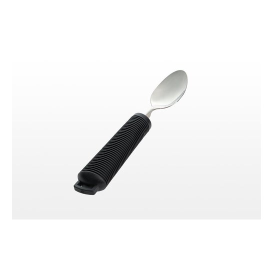 Fabricada em aço inoxidável, conta com um cabo revestido de borracha antiderrapante. Esta colher pode ser dobrada em vários ângulos, adaptando-se tanto a pessoas destros como canhotos.