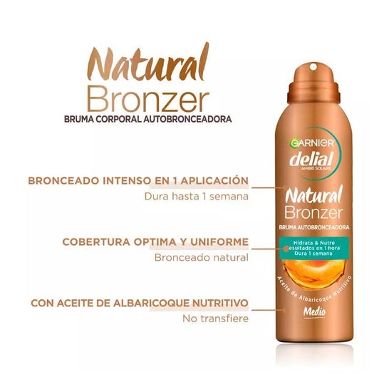 Névoa corporal autobronzeadora formulada com óleo de caroço de damasco, glicerina e vitamina E. Ajuda a conseguir um bronzeado uniforme e de aspecto natural durante até uma semana. Os seus ingredientes têm propriedades hidratantes e nutritivas. Adequado para todos os tipos de pele.