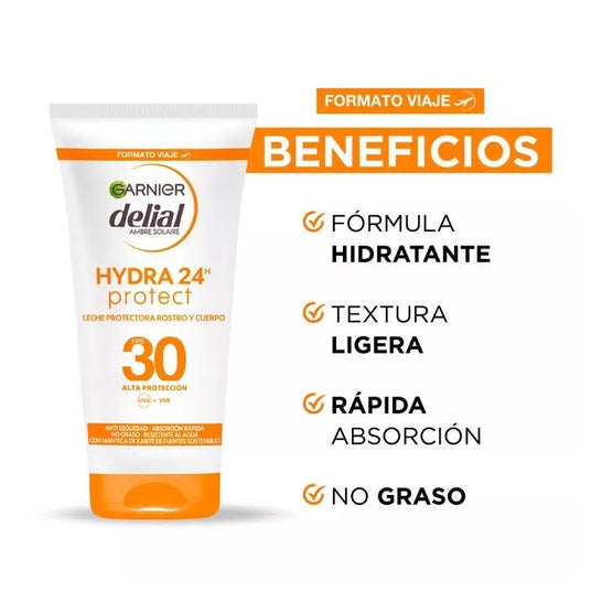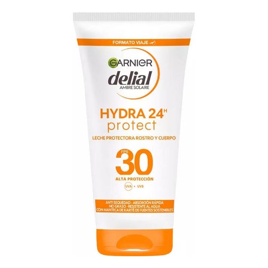 Garnier Delial Hydra 24h Protect Protect Milk SPF30 50ml é um protector solar facial e corporal que protege a pele contra os raios UVB, UVB e infravermelhos.