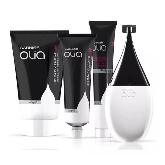 O kit inclui um creme de coloração, um creme revelador e um condicionador, bem como um aplicador ergonómico para maior precisão. A linha de coloração Olia oferece uma vasta gama de até 30 tonalidades à escolha.