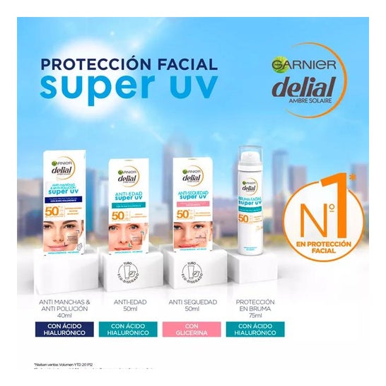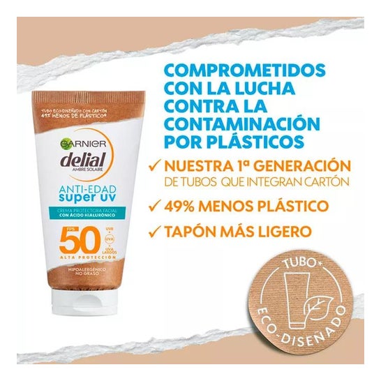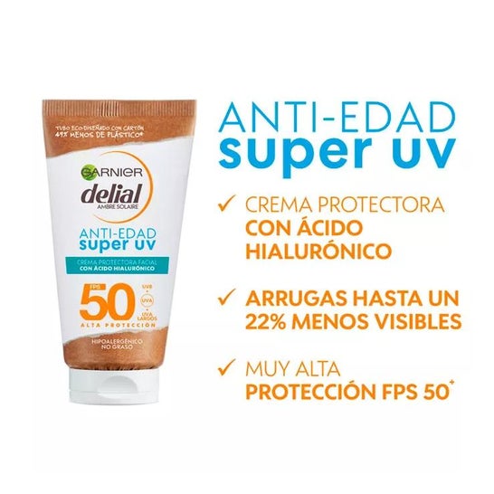 Garnier Delial Anti-Ageing Super UV Protective Face Cream SPF50 50ml é um protector solar facial que protege a pele contra os raios UVA, UBV e UVA longos.