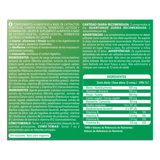 Um suplemento alimentar à base de extractos naturais, carvão vegetal, fermentos lácticos e vitaminas, que ajuda a eliminar os gases. A hortelã-pimenta, o funcho e os cominhos contribuem para eliminar o excesso de gases e ajudam a reduzir a sensação de estômago inchado. A camomila proporciona conforto digestivo e os fermentos lácteos ajudam a manter uma flora intestinal equilibrada. Este suplemento alimentar não substitui um regime alimentar variado e equilibrado e um estilo de vida saudável. Não exceder a dose diária recomendada. Manter fora do alcance das crianças. Não administrar a crianças com menos de 12 anos de idade. Sem açúcar. Sem lactose. Sem glúten. Adequado para veganos.