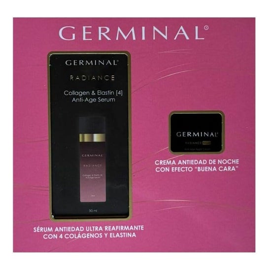 Germinal Radiance Pack Colágeno & Elastina Sérum 30 ml + Noite 15 ml é um conjunto projetado para combater os sinais de envelhecimento na pele. Este pack inclui um sérum anti-idade de 30 ml e um creme antienvelhecimento com FPS 30+ de 15 ml, oferecendo uma solução integral para o cuidado facial.