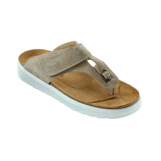 Sandálias femininas anatómicas de cor de areia, macias e flexíveis. Têm uma sola de borracha branca antiderrapante, um calcanhar largo que amortece o pé, uma confortável parte superior anatómica auto-moldável com um prático fecho ajustável e uma correia do dedo do pé ajustável. Sandálias especialmente concebidas para proporcionar estabilidade e conforto aos pés e para ajudar a reduzir a sensação de peso nas pernas.