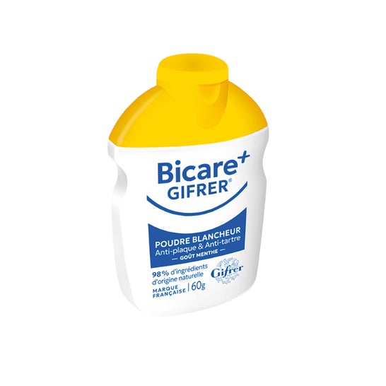 Gifrer Bicare+ Pó Blanqueador 60g é um tratamento clareador à base de bicarbonato de sódio e bromelina (mistura de enzimas extraídas do abacaxi) que ajuda a prevenir a formação de placa dental e tártaro. A ação sinérgica do bicarbonato de sódio e da bromelina reduz eficazmente a placa dental e a descoloração superficial causada pelo chá, café e tabaco. O bicarbonato de sódio também ajuda a aliviar a dor causada por úlceras bucais e infecções fúngicas das membranas mucosas da boca, graças à sua ação antisséptica. Bicare Plus de dupla ação é utilizado ao escovar os dentes para deixá-los mais brancos.