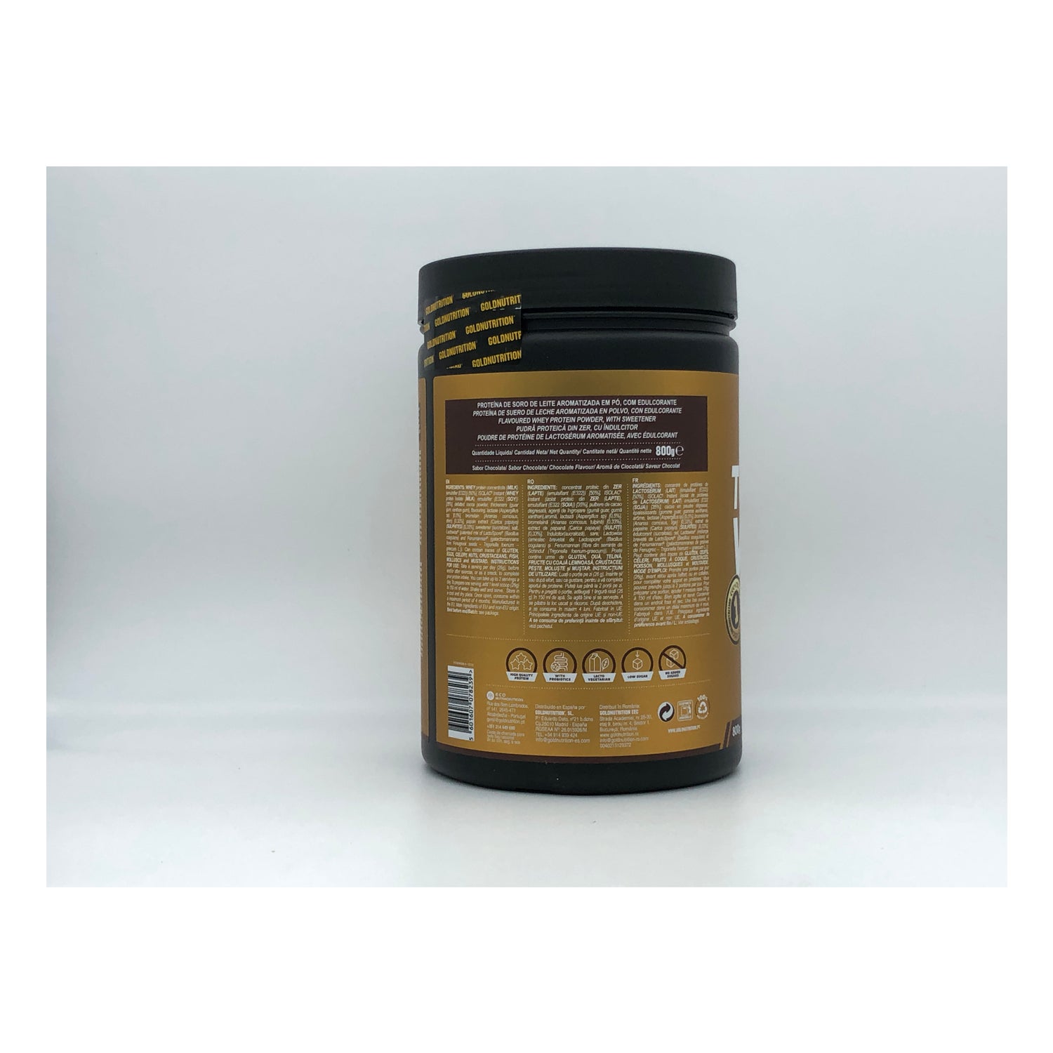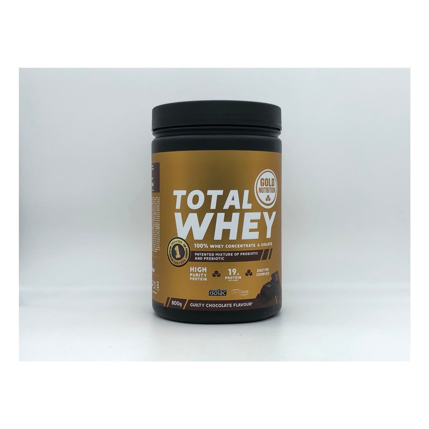 Gold Nutrition Total Whey Chocolate 800g é um suplemento alimentar com proteínas concentradas e isoladas de soro de leite.