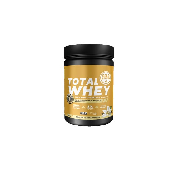 Gold Nutrition Total Whey Vanilla 800g é um suplemento alimentar com proteína de soro de leite concentrada e isolada.