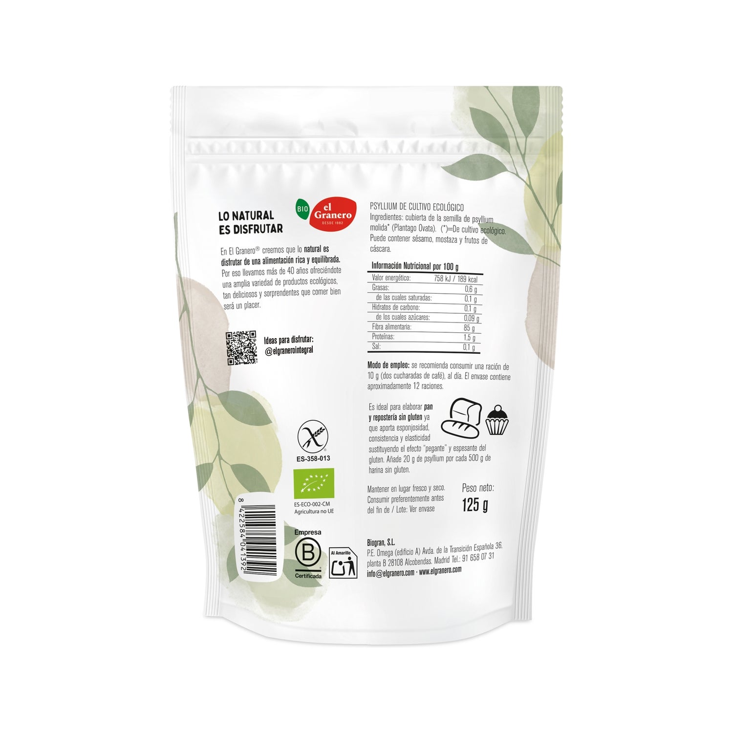 Preparação alimentar à base de sementes de psílio moídas e sem glúten. É uma alternativa às farinhas convencionais, útil para fazer pães, bolachas ou bolos para toda a família. Tem um alto teor de nutrientes e fibras solúveis. Adequado para adultos e crianças.